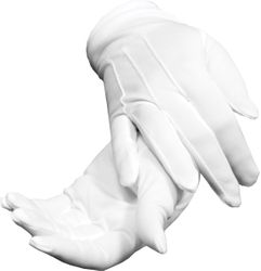 These "one size fits all" white polyester stretch gloves are machine washable and dress uniform quality.